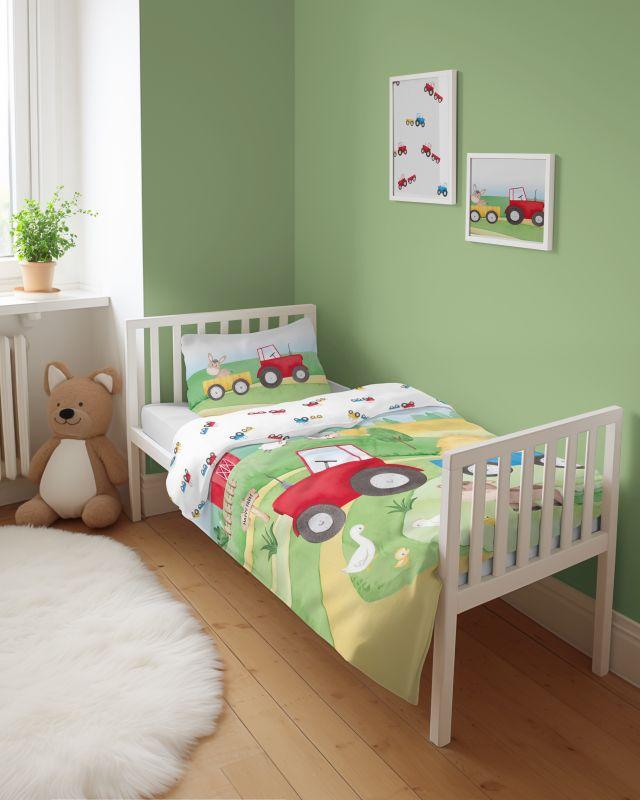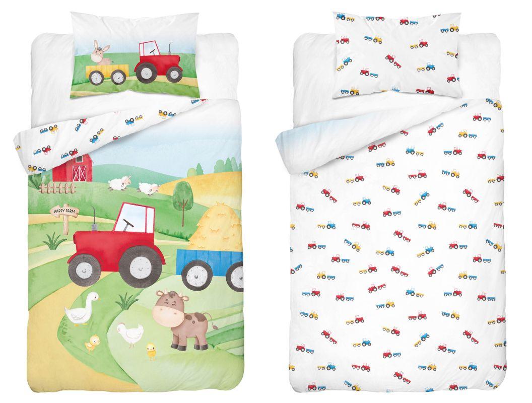 Povlečení do postýlky Šťastná farma červená je vyrobeno ze 100% bavlny. Povlečení do postýlky s potiskem kresleného červeného traktůrku na přední straně, druhá strana je odlišná. Bavlněné povlečení Šťastná farma červená v rozměru deka 100x135cm a polštář 40x60cm. Bavlněné povlečení do postýlky Šťastná farma červená se zapínáním na zip.