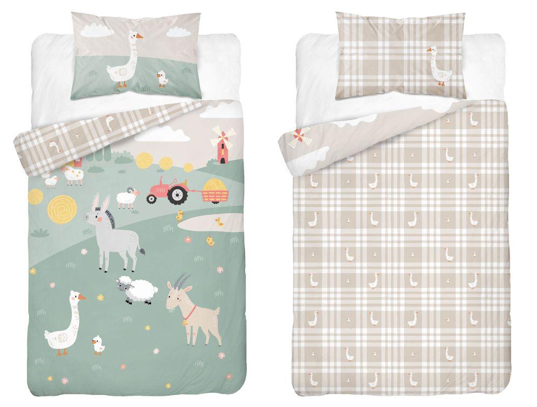 Povlečení do postýlky Zvířátka z farmy je vyrobeno ze 100% bavlny. Povlečení do postýlky s potiskem kreslených zvířátek na přední straně, druhá strana je odlišná. Bavlněné povlečení Zvířátka z farmy v rozměru deka 100x135cm a polštář 40x60cm. Bavlněné povlečení do postýlky Zvířátka z farmy B se zapínáním na zip.